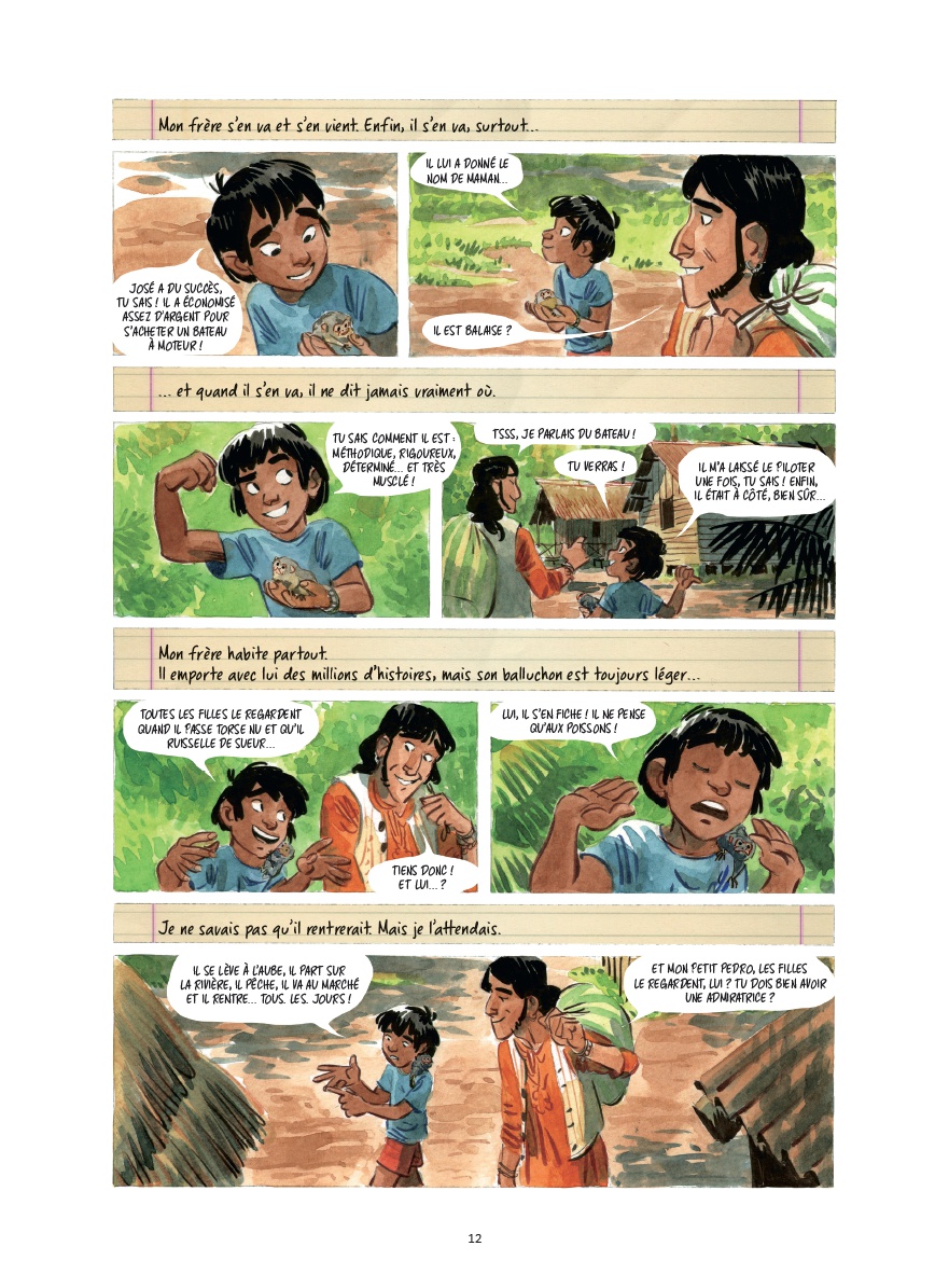 Pedro vit dans la forêt amazonienne dans un petit village. Il attend toujours avec impatience le retour de voyage de son frangin : Vincente. Ce dernier l’abreuve constamment de ses récits d’aventures. Le petit frère, gros lecteur, est fasciné par ce grand frère globe-trotteur. Mais un matin Vincente disparaît en volant la barque familiale. On comprend alors qu’il n’est certainement pas ce qu’il disait être. Pedro part alors sur ses traces pour comprendre. Il va se prendre la réalité du monde en pleine face. Un récit exotique magnifique sur l’enfance et une quête initiatique sur fond de fascination pour le monde moderne.