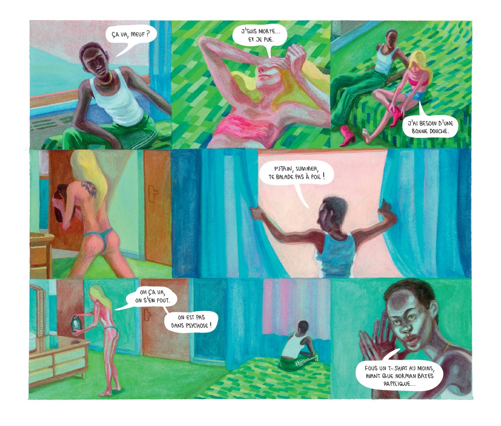 En 2015, Becki et Summer sont deux jeunes femmes qui roulent à bord d’une vielle Ford. Ce road-movie quête paraît, dans un premier temps, sans but. Il va finalement s’éclairer au fil des pages et au fil des kilomètres. Les deux amies roulent vers le Sud en fuyant la ville dévastée ancienne ville de l’automobile : Détroit. Toutes deux remontent le fil de leurs histoires, de leurs racines. Summer essaie de découvrir l’histoire de sa mère Gloria ancienne gloire du cinéma hollywoodien. Elles se confient sur leurs drames familiaux respectifs et Becki noircit des planches au kilomètre. Un roman graphique éblouissant aux styles graphiques variés et une histoire envoutante. Sublime et cinématographique. |