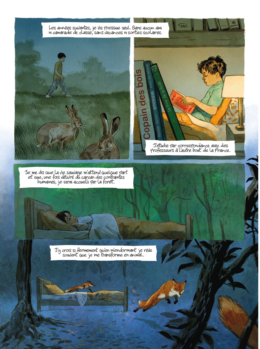 A vingt ans, Geoffroy Delorme déjà déscolarisé depuis des années, décide de sortir du monde des humains. Il s’enfonce dans la forêt de Louviers en Normandie à la rencontre de la faune locale. Au pied des arbres il va croiser la route d’un jeune chevreuil curieux et avenant. Geoffroy va nouer un lien extrêmement fort avec cet animal et découvrir la vie à hauteur d’animal. Pendant sept ans, il va découvrir la vie de ces animaux si curieux et intelligents, il va se nourrir comme eux, dormir comme eux et devenir l’un des leurs. Un album splendide sur la nature, la liberté et le monde sauvage. |