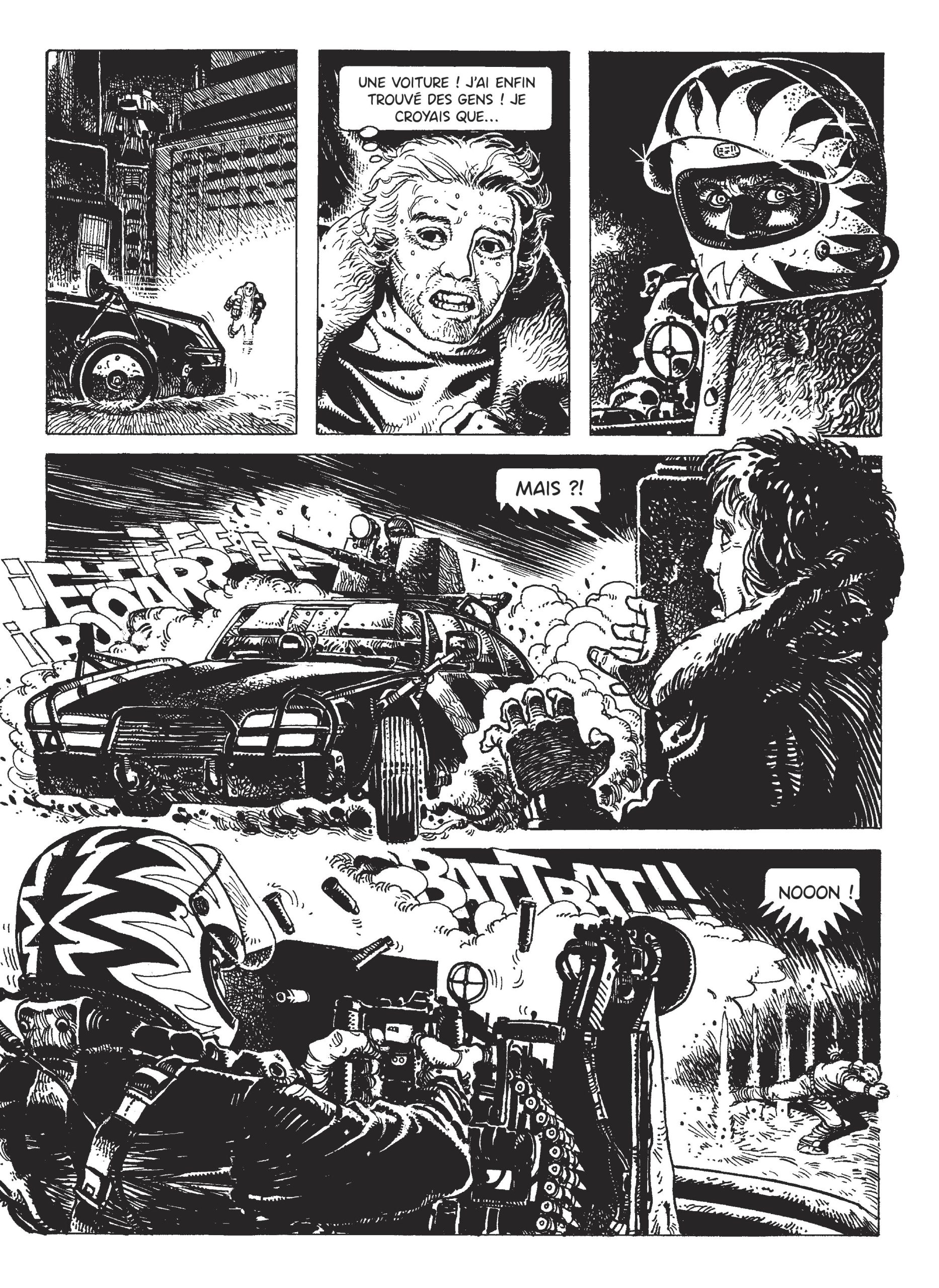 Jean vient une existence terne et routinière à Paris. Le soir il va danser sans joie ni gaieté avec sa douce. Mais ce jour-là en rentrant à pied, il se perd et découvre une ville qui se dégrade de minutes en minutes. Les boutiques sont défoncées et les ruelles sordides et vides. Et le jour ne se lève pas. Jean panique et tombe nez à nez avec une voiture de sport mitrailleuse sur le toit qui le canarde. Il ne devra son salut qu’à l’intervention d’une mystérieuse jeune femme armée jusqu’aux dents. Ce récit inédit de Juan Gimenez (auteur des méta-barons) est un récit d’anticipation énigmatique très Métal Hurlant style. On navigue dans un monde entre la quatrième dimension et Mad Max. Un one-shot jouissif pour tout fan de Science-fiction old school. |