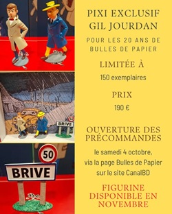 La scène tirée de Gil Jourdan éditée par Pixi pour les 20 ans de la librairie est en vente sur le portail canal bd et elle sera disponible en magasin en Novembre 2025.